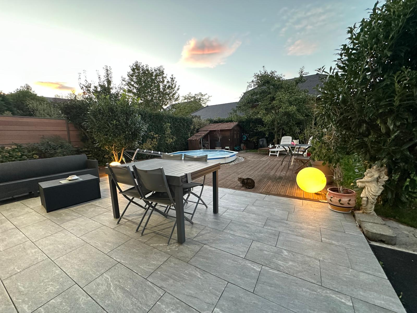 Jardin avec cabanon, piscine, terrasse bois, terrasse carrelée, portillon d'accès à l'espace extérieur, lumière d'ambiance, filtration de la piscine...